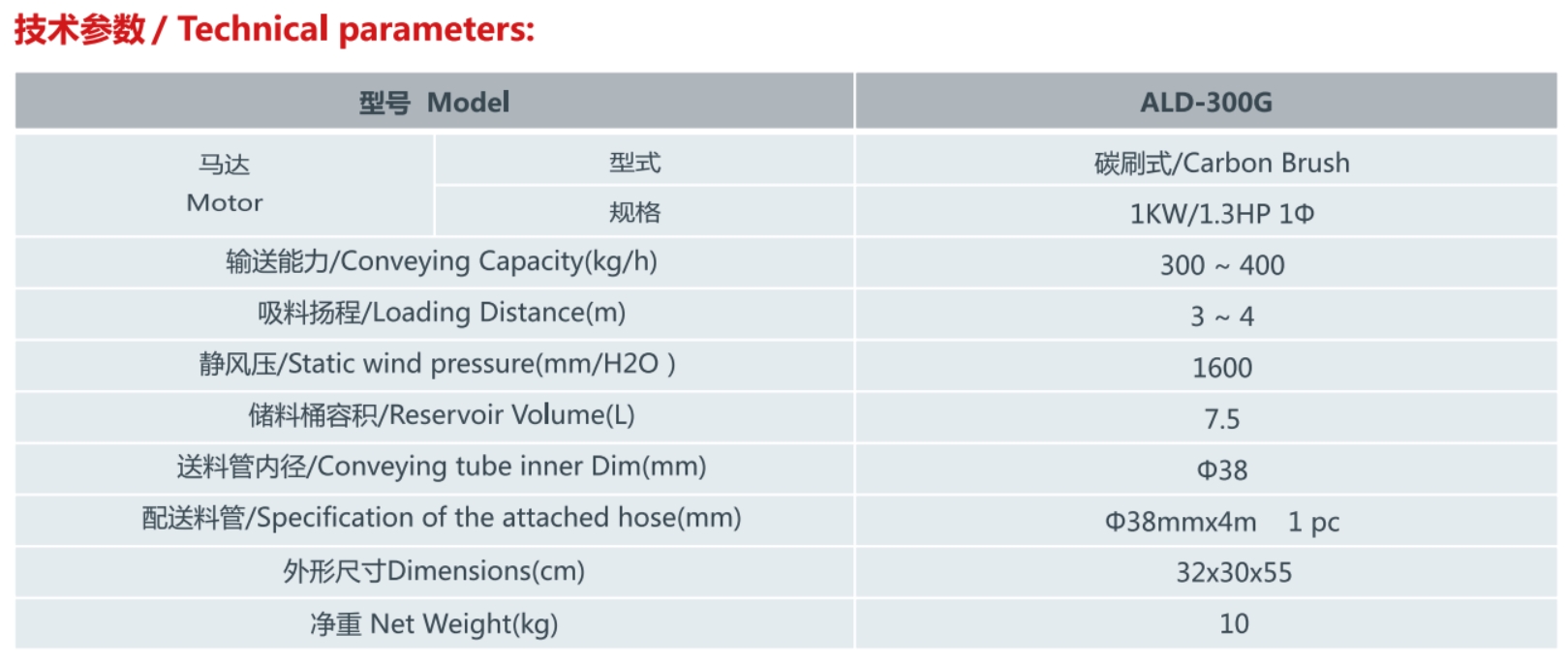 สามารถดูดเม็ดพลาสติกได้ 200-250 กก./ชม. (ในระยะทาง 3-4 เมตร)