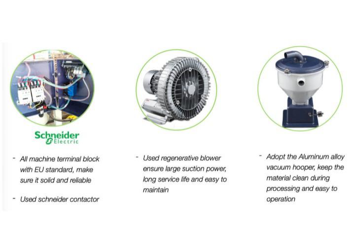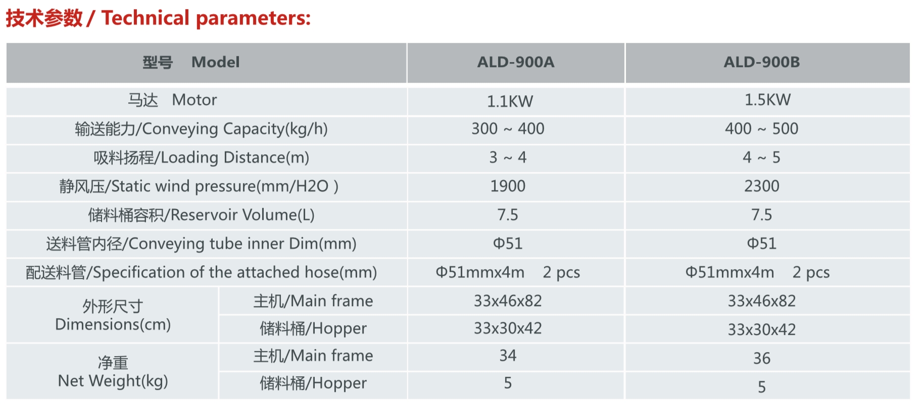 มอเตอร์ขนาด 1.5 กิโลวัตต์ สามารถดูดเม็ดพลาสติกได้ 200-250 กก./ชม. (ในระยะทาง 4-5 เมตร)